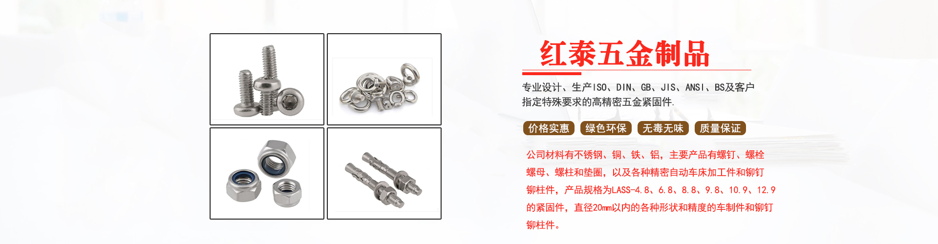 東莞市紅泰五金制品有限公司,公司占地六千多平方米,擁有五十多組螺絲機(jī)及六十臺(tái)自動(dòng)車床設(shè)備。是一家專業(yè)設(shè)計(jì)、生產(chǎn)ISO、DIN、GB、JIS、ANSI、BS及客戶指定特殊要求的高精密五金緊固件的制造企業(yè)。