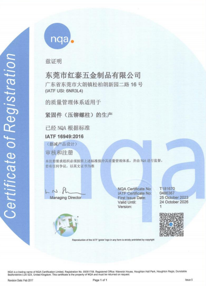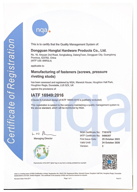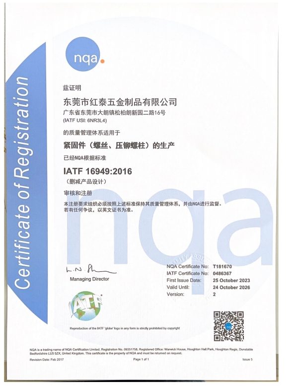 東莞市紅泰五金制品有限公司,公司占地六千多平方米,擁有五十多組螺絲機(jī)及六十臺(tái)自動(dòng)車床設(shè)備。是一家專業(yè)設(shè)計(jì)、生產(chǎn)ISO、DIN、GB、JIS、ANSI、BS及客戶指定特殊要求的高精密五金緊固件的制造企業(yè)。